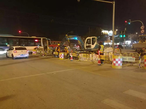 各管線橫穿濟(jì)微路的施工過(guò)程中,考慮到濟(jì)微路為南北交通主干道,本著“少封一米是一米”的施工理念,從減少交通影響,保證車輛和行人通行角度出發(fā),不但將施工全部安排在夜間10點(diǎn)之后,而且經(jīng)過(guò)反復(fù)優(yōu)化施工分區(qū),將原計(jì)劃半幅封閉縮小到逐車道封閉的方式進(jìn)行,早6點(diǎn)高峰來(lái)臨前恢復(fù)交通。
