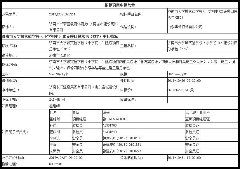 濟南市大學城實驗學校(小學初中)建設項目總承包(EPC)中標公示