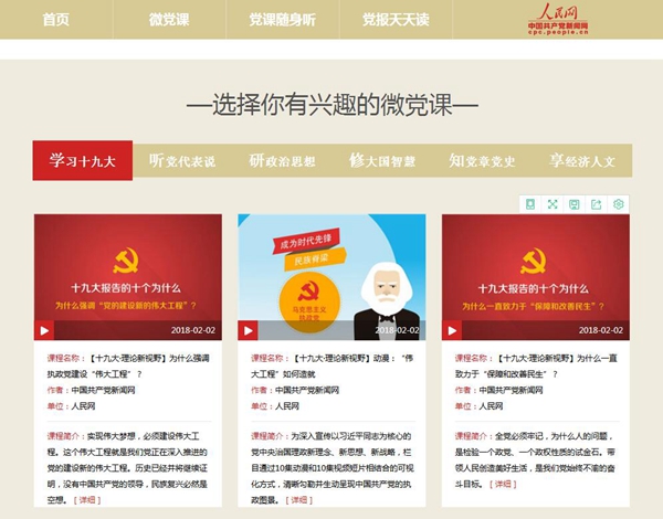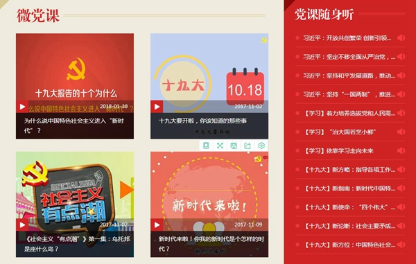 《十九大報(bào)告的十個(gè)為什么》、《社會(huì)主義有點(diǎn)潮》、《給90后講講馬克思》、《馬克思是對的》、《我是共產(chǎn)黨員》……“云黨課”學(xué)習(xí)平臺(tái)目前重點(diǎn)收錄了十九大精神系列解讀、最新最潮的系列微視頻、以及我黨十八大以來的黨建工作、治國理政等相關(guān)黨課學(xué)習(xí)視頻課程共計(jì)200余部,涵蓋黨建、政治、經(jīng)濟(jì)、文化、社會(huì)、外交等各個(gè)領(lǐng)域。平臺(tái)主要分為三大板塊:微黨課、黨課隨身聽、黨報(bào)天天讀,兼容PC端與手機(jī)端,方便廣大黨員干部及群眾多視角、多形式學(xué)習(xí)黨課內(nèi)容。
