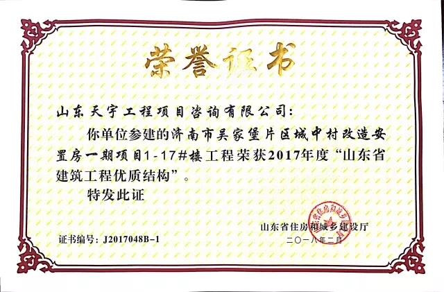 質(zhì)量是企業(yè)的生命。在山東省住房和城鄉(xiāng)建設廳組織的2017年度“山東省建筑工程優(yōu)質(zhì)結(jié)構(gòu)”評審中,吳家堡片區(qū)安置房一期工程1#到17#樓(共計17棟樓),憑借過硬的質(zhì)量、完善的管理順利通過專家考評,喜獲“山東省建筑工程優(yōu)質(zhì)結(jié)構(gòu)”。“山東省建筑工程優(yōu)質(zhì)結(jié)構(gòu)”代表著全省各建筑企業(yè)施工質(zhì)量管理的領先水平,為沖刺山東省建筑工程質(zhì)量最高榮譽“泰山杯”奠定了基礎。