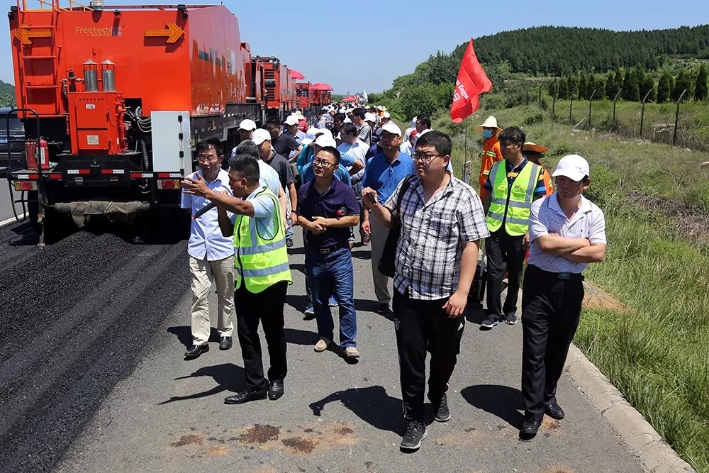 6月28日,由濟(jì)南金曰公路工程有限公司組織承辦的濟(jì)南公路學(xué)會(huì)就地?zé)嵩偕夹g(shù)交流及現(xiàn)場觀摩會(huì)在平陰舉行。山東公路學(xué)會(huì)副秘書長劉成海、濟(jì)南市公路管理局副局長任順祥、濟(jì)南城市建設(shè)集團(tuán)副總經(jīng)理安玉坤等領(lǐng)導(dǎo)同志,及省內(nèi)20多家公路學(xué)會(huì)、設(shè)計(jì)院相關(guān)負(fù)責(zé)人參加活動(dòng)。就施工工藝進(jìn)行介紹交流后,與會(huì)人員到金曰承建的濟(jì)菏高速公路維修工程WX-1標(biāo)段,現(xiàn)場觀摩了就地?zé)嵩偕夹g(shù)的施工情況。