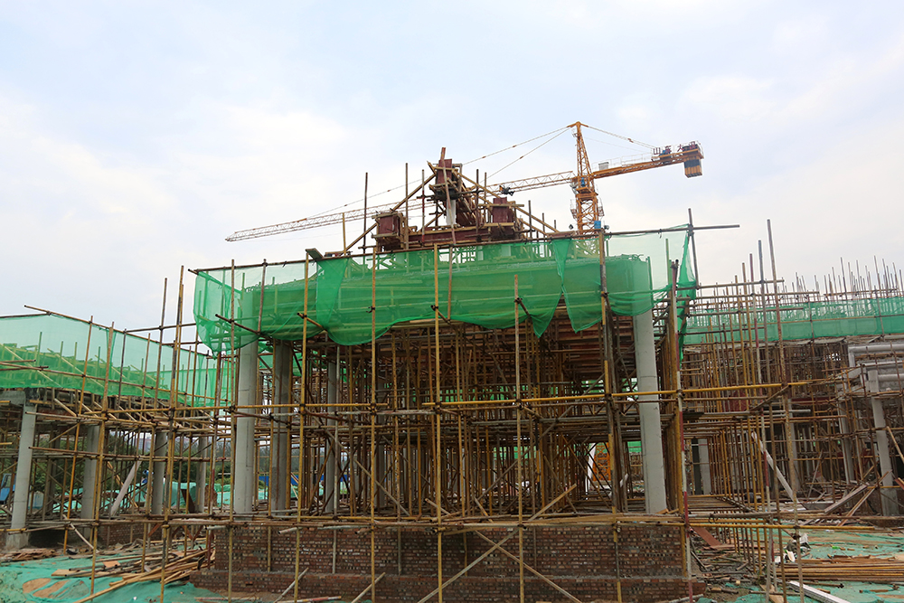 城門樓的工程量最大,項(xiàng)目內(nèi)施工難度最大的是緊靠城門樓的一棟2.5層(局部三層)的中西結(jié)合建筑,該建筑內(nèi)部為錯層結(jié)構(gòu),樓板需要逐層澆筑,同時(shí)還有單層挑高8米的高支模(高支模是指支模高度大于或等于5m時(shí)的支模作業(yè))作業(yè),施工方案經(jīng)專家反復(fù)論證后施行,為保證工期,這棟2.5層的“小建筑”最多80位工人同時(shí)施工。同樣,為了整個(gè)項(xiàng)目的推進(jìn)速度,項(xiàng)目高峰作業(yè)期400多位工人同時(shí)施工,保證項(xiàng)目按質(zhì)按量推進(jìn)。