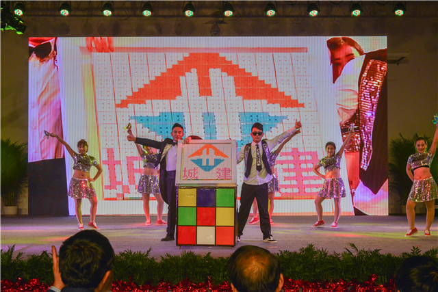 在歡快喜悅的歌舞《拜新年》中,匯演拉開序幕,紅紅火火的舞臺(tái),映射著蒸蒸日上的發(fā)展勢(shì)頭。舞蹈《成長(zhǎng)》《奮進(jìn)》以激昂的音樂,吹響了催人奮進(jìn)的號(hào)角,用動(dòng)感的舞步,舞出了城建鐵軍的蓬勃朝氣?!恶R路情緣》《鐵軍男相親記》《生日》《真相》《男爭(zhēng)女辯》《筑夢(mèng)同行》等語言類節(jié)目圍繞生產(chǎn)經(jīng)營(yíng)精心編排,真實(shí)感人,催人奮進(jìn)。勵(lì)志感人的歌曲,絢麗多彩的歌伴舞,酷炫的舞蹈,神秘的魔術(shù),魔幻的黑光劇,生龍活虎的京劇,讓觀眾著實(shí)過了一把眼癮,臺(tái)下掌聲不斷,歡欣喜悅的氣氛一浪高過一浪。小品里父母、妻子、孩子那一段段心里話,令人感同身受,潸然淚下,家屬們用實(shí)際行動(dòng)表達(dá)了對(duì)企業(yè)最大的理解和支持,大家在這個(gè)溫暖的大家庭中,以誠(chéng)相待,溫馨彼此。在激動(dòng)人心的歌舞串燒《開創(chuàng)未來》中,匯演圓滿落下帷幕,集團(tuán)領(lǐng)導(dǎo)與演職人員合影留念。
