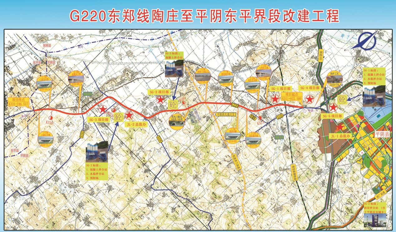 G220東鄭線陶莊至平陰東平界段改建工程項目位于濟南市平陰縣境內(nèi),路線全長19.424km,其中利用原路改建段16.635公里,新建段2.789公里。全線設(shè)大橋2座、中橋6座、小橋3座、涵洞53道、隧道440米/1座、分離立交1座,新建養(yǎng)護工區(qū)1處。全線采用雙向四車道一級公路標準,設(shè)計速度80公里/小時,路基寬度一般路段為24.5米;東阿鎮(zhèn)路段路基寬37米,設(shè)置非機動車道;隧道進出口分離路基路段路基寬12.25米,批準概算6.54億元,計劃總工期579天。