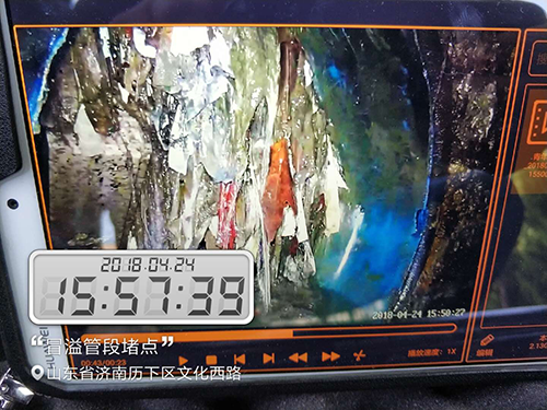 應(yīng)急搶險小組立即制定搶險計劃,使用管道潛望鏡等檢測設(shè)備對冒溢原因進行排查,經(jīng)排查初步判定為下游管口阻塞造成,由于現(xiàn)場處于綠化帶內(nèi),機械設(shè)備無法進入,搶險小組根據(jù)實際情況現(xiàn)場設(shè)計焊接作業(yè)工具,配合管道潛望鏡對管道進行人工掏挖,經(jīng)過4個小時的清理,將管道內(nèi)部分垃圾清除,首先確保檢查井停止冒溢。但經(jīng)過管道潛望鏡再次查看發(fā)現(xiàn)管道內(nèi)依然存在40*20*15cm、60*20*15cm立沿石兩塊無法完全清除,后期仍存在冒溢風(fēng)險,為確保管網(wǎng)長期正常運行,搶險小組當機立斷制定人工下井作業(yè)清除方案,務(wù)必將阻塞點徹底清除掉。