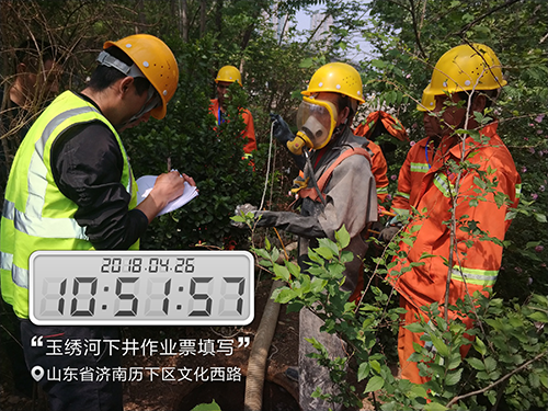由于人工下井作業(yè)危險較大,方案制定完成后搶險小組立即向公司安全質(zhì)量部進行匯報,經(jīng)過安全質(zhì)量部批準于4.26日進行人工下井作業(yè)?,F(xiàn)場工作人員嚴格按照下井作業(yè)施工流程,認真填寫《下井作業(yè)票》、《有限空間作業(yè)票》等最終將工作人員將阻塞在管口的立沿石等阻塞物取出,管道又恢復(fù)了正常運行,玉繡河也恢復(fù)了往日的清澈。