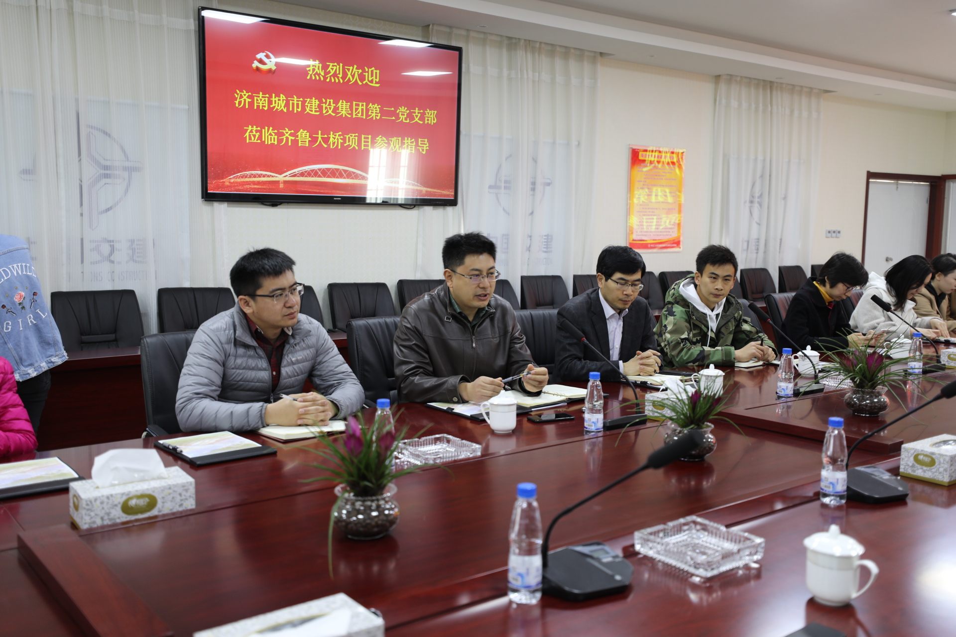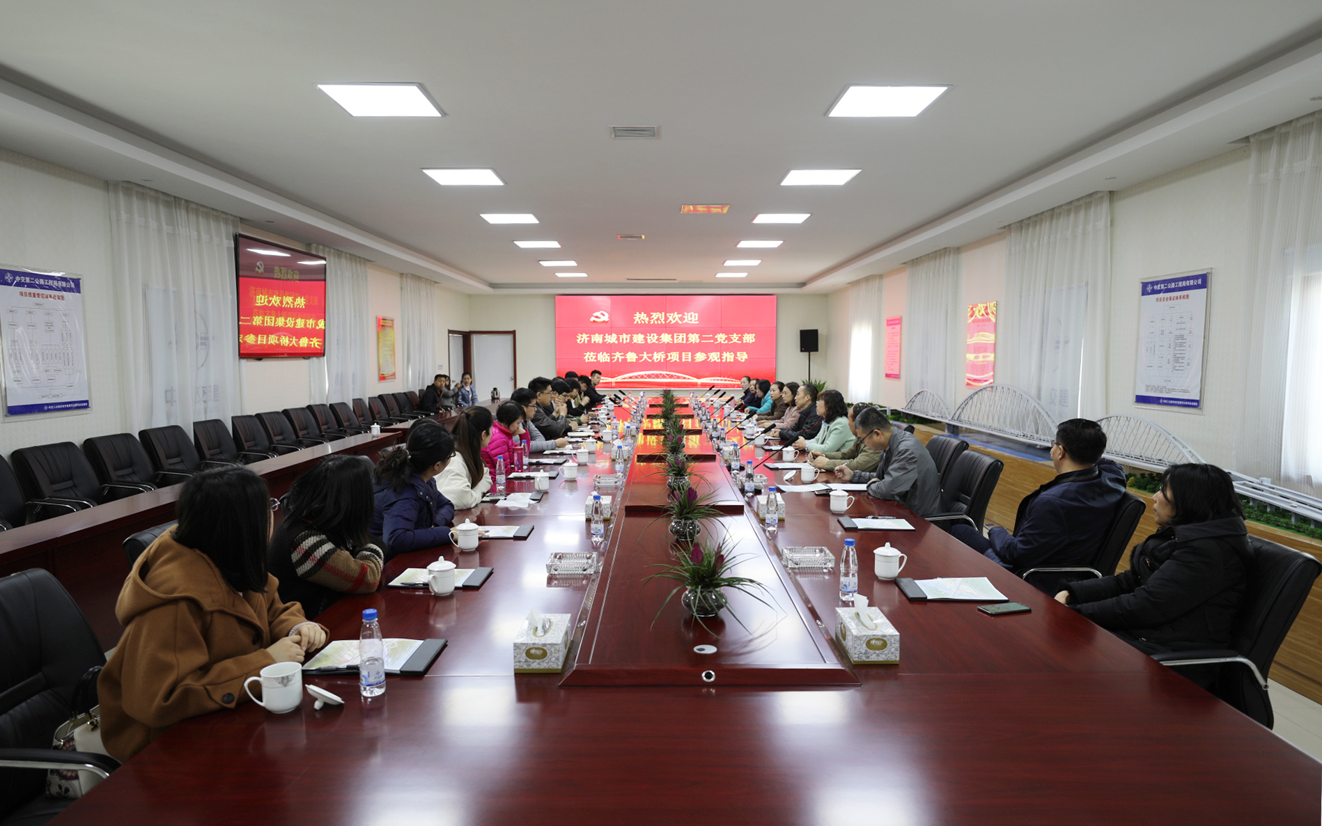全體人員在集團(tuán)總會(huì)計(jì)師范天云的帶領(lǐng)下,首先來到齊魯大道北延工程項(xiàng)目經(jīng)理部,與公司副總經(jīng)理趙世超及工作人員進(jìn)行了座談,雙方首先介紹了各自支部情況及組織建設(shè)情況并進(jìn)行了交流。隨后,項(xiàng)目負(fù)責(zé)人對(duì)工程進(jìn)行了詳細(xì)的介紹,并參觀了齊魯黃河大橋橋梁模型、觀看了黃河大橋建設(shè)宣傳片,展示了齊魯黃河大橋的建設(shè)過程及原理。作為目前同類橋型跨徑世界第一網(wǎng)狀吊桿系桿拱橋,其所展現(xiàn)的創(chuàng)新技術(shù)、建成效果以及打造的“黃河橋梁文化”令人驚嘆和期待。