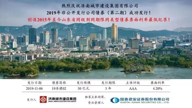 2019年11月6日,濟南城市建設(shè)集團非公開發(fā)行2019年公司債券(第二期)(“19濟建02”)發(fā)行圓滿落地,創(chuàng)造2015年至今山東省同級別同期限同類型債券票面利率最低紀(jì)錄。本期債券發(fā)行得到了市場的廣泛認可,投資者認購踴躍。19濟建02低利率發(fā)行,充分展現(xiàn)了投資者對建設(shè)集團領(lǐng)先的行業(yè)地位、良好的品牌形象以及穩(wěn)健的財務(wù)政策等方面的肯定。