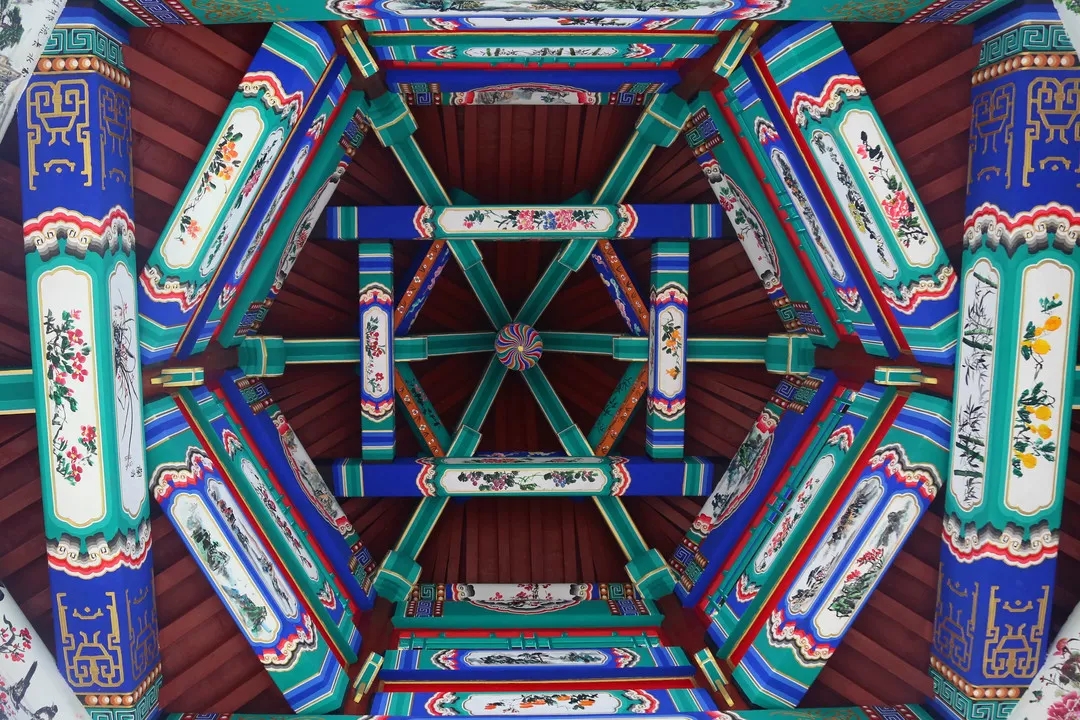項(xiàng)目中仿古建筑的涂刷油漆部分做地仗都是采用“豬血+桐油”的古法油漆(“地仗”是一種采用“一麻五灰”的古老傳統(tǒng)工藝的施工做法)。仿古地仗油漆成活一般需要基層處理、下竹釘、捉縫灰、通灰、裹布等12道工序。清代彩繪的種類非常豐富,從紋飾的主體框架構(gòu)圖和題材方面分類可分五大類:和璽類、旋子類、蘇式類、海墁類和吉祥草類。“親王府”區(qū)域的建筑彩繪主要采用了三種繪畫形式,王府中軸線上建筑部分采用旋子墨線小點(diǎn)金彩繪,體現(xiàn)為輪廓線均用墨線,花心點(diǎn)金的形式;配房部分采用雅伍墨旋子彩繪,指完全不用金,線條用墨,旋子用藍(lán)、綠、白、黑四色,花瓣不起暈;長廊與園林部分的小型建筑部分采用蘇式彩繪,蘇式彩繪畫面內(nèi)容豐富,自然山水、花鳥魚蟲、各式人物一應(yīng)俱全。彩繪待地仗完成后還需依次為:丈量起譜子、刷生油、磨平、過水布、分中、打普子、瀝大小粉等13道工序。