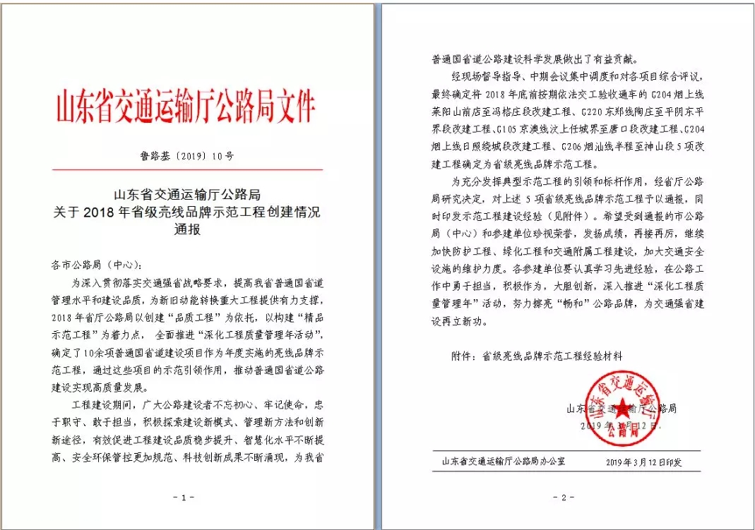 由濟(jì)南城市建設(shè)集團(tuán)所屬金諾公司負(fù)責(zé)代建管理、金衢公司負(fù)責(zé)設(shè)計(jì)、金曰等公司參與建設(shè)的G220東鄭線陶莊至平陰東平界段改建工程(簡稱“G220平陰南段改建工程”)喜獲山東省交通運(yùn)輸廳公路局“2018年省級亮線品牌示范工程”榮譽(yù)稱號。