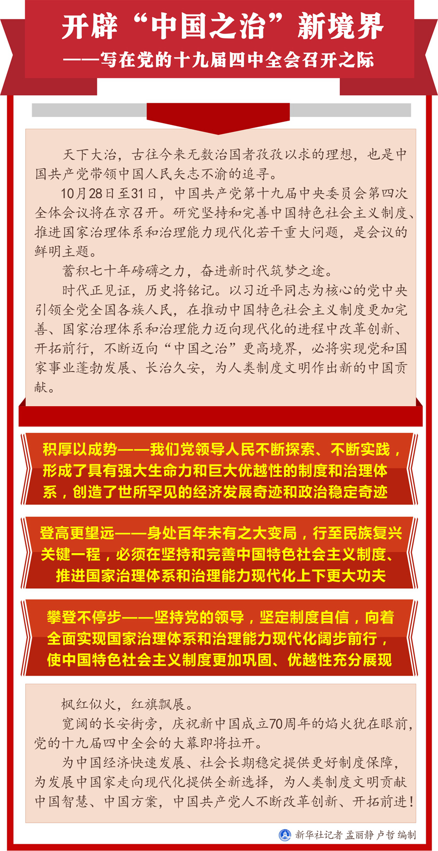 10月28日至31日,中國共產(chǎn)黨第十九屆中央委員會第四次全體會議將在京召開。研究堅持和完善中國特色社會主義制度、推進國家治理體系和治理能力現(xiàn)代化若干重大問題,是會議的鮮明主題。
