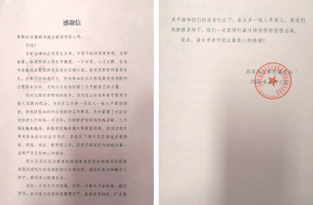 近日,一封來自槐蔭區(qū)段店社區(qū)居民委員會的感謝信發(fā)至濟南城市建設(shè)集團,感謝信的“主角”是集團所屬華誼兄弟(濟南)電影城投資開發(fā)有限公司的孫袖清同志。新型冠狀病毒肺炎疫情發(fā)生以來,孫袖清放棄春節(jié)假期和周末休息時間,個人主動聯(lián)系報名,積極參與社區(qū)疫情防控志愿服務(wù)工作,以實際行動彰顯黨員和建設(shè)集團人責任擔當,用無私奉獻展現(xiàn)一名“80后”的青春力量,與社區(qū)工作人員共同筑牢社區(qū)疫情防控安全線。