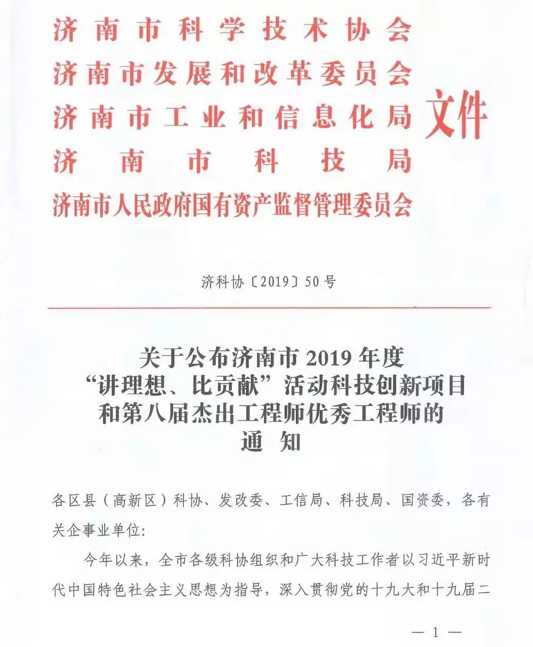 為了更好激勵科技工作者胸懷自主創(chuàng)新夢想,把實現(xiàn)自身價值同企業(yè)發(fā)展和實現(xiàn)中國夢緊密結(jié)合起來,倡導和樹立社會主義核心價值觀,弘揚創(chuàng)新精神和創(chuàng)新文化,日前,根據(jù)《濟南市“講理想、比貢獻”活動實施辦法》,濟南市發(fā)改委、經(jīng)信委、科技局、國資委、科協(xié)聯(lián)合組織開展了“講理想、比貢獻,奮力實現(xiàn)中國夢”活動。經(jīng)過各級科協(xié)組織推薦、專家評審、社會公示和市“講理想、比貢獻”活動領(lǐng)導小組審定,濟南金衢公路勘察設(shè)計研究有限公司《協(xié)同設(shè)計及路網(wǎng)數(shù)據(jù)庫管理系統(tǒng)》獲得濟南市2019年度科技創(chuàng)新項目獎。