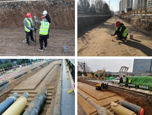 超前策劃,優(yōu)化方案,保證施工有序推進(jìn)。“工期緊、任務(wù)重”是本工程最大的特點(diǎn),各種新建管線約20公里,管線安裝工期僅有40天。按照最初的設(shè)計(jì)方案,各管線位置分散在快車(chē)道、人行道、綠化帶等不同的區(qū)域,施工區(qū)域大,管線高程沖突、干擾明顯,無(wú)法實(shí)現(xiàn)快速、同時(shí)施工,且全線受多處河道、繞城高速、交叉路口及橫穿管線等難度較大節(jié)點(diǎn)制約,不利于后期恢復(fù),也不能滿足施工期間的通行要求。經(jīng)過(guò)多次研究重新確定各種管線位置分布,將所有管線集中在一起施工,按照“確保大管徑位置、小管徑上翻”原則,采取“大管線靠南超前施工,小管線靠北跟進(jìn)施工”形成流水作業(yè),保證高效建設(shè)、快速恢復(fù)、按時(shí)通車(chē)。工程開(kāi)工后,各參建分公司迅速行動(dòng),調(diào)集精銳力量和充足資源保證快速施工,3月30日按期完成所有管線安裝,4月15日道路基層全部完成,4月20日附屬工程全部完成。
