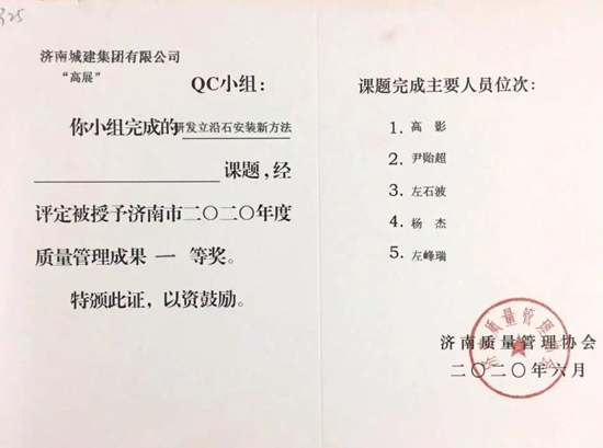 近日,濟南質量管理協(xié)會發(fā)布了“關于2020年度濟南市群眾性質量管理活動優(yōu)秀成果、先進單位和個人的通知”,集團所屬濟南城建集團有限公司、金曰公司、金宇公司、金衢公司、金諾公司均獲多項榮譽。