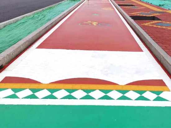 此次創(chuàng)新將SP彩色壓花、熒光瀝青路面工藝在慢車道上進行試驗,施工時選用紅、綠、藍三種基礎(chǔ)顏色分段進行。通過噴涂SP專用涂料,改變?yōu)r青面層顏色,不但提高了道路辨識度,同時能夠在無分隔帶道路中明確機非車道界限,有利于規(guī)范非機動車規(guī)范行車,降低事故發(fā)生概率。