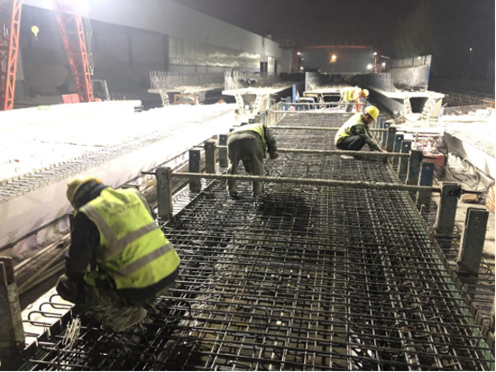 東巨野河2號大橋預(yù)制梁板的架設(shè)為全線預(yù)制梁板架設(shè)的難點,該橋全長近千米,架設(shè)角度、重量及梁寬都是需一一克服的重點,項目采用220噸大型架橋機(jī)進(jìn)行架設(shè),梁寬與架橋機(jī)內(nèi)寬僅有0.2米的空隙,為確保安全,架梁全過程兩側(cè)同時監(jiān)控,為保證梁板架設(shè)的進(jìn)度,項目部主動增加設(shè)備投入,果斷采用兩臺架橋機(jī)兩幅同步架設(shè),最快時一天架設(shè)7片梁板。不僅跨越東巨野河,還要跨越交通繁忙的世紀(jì)大道、經(jīng)十東路,每一項節(jié)點工程都是千頭萬緒,逐一突破。