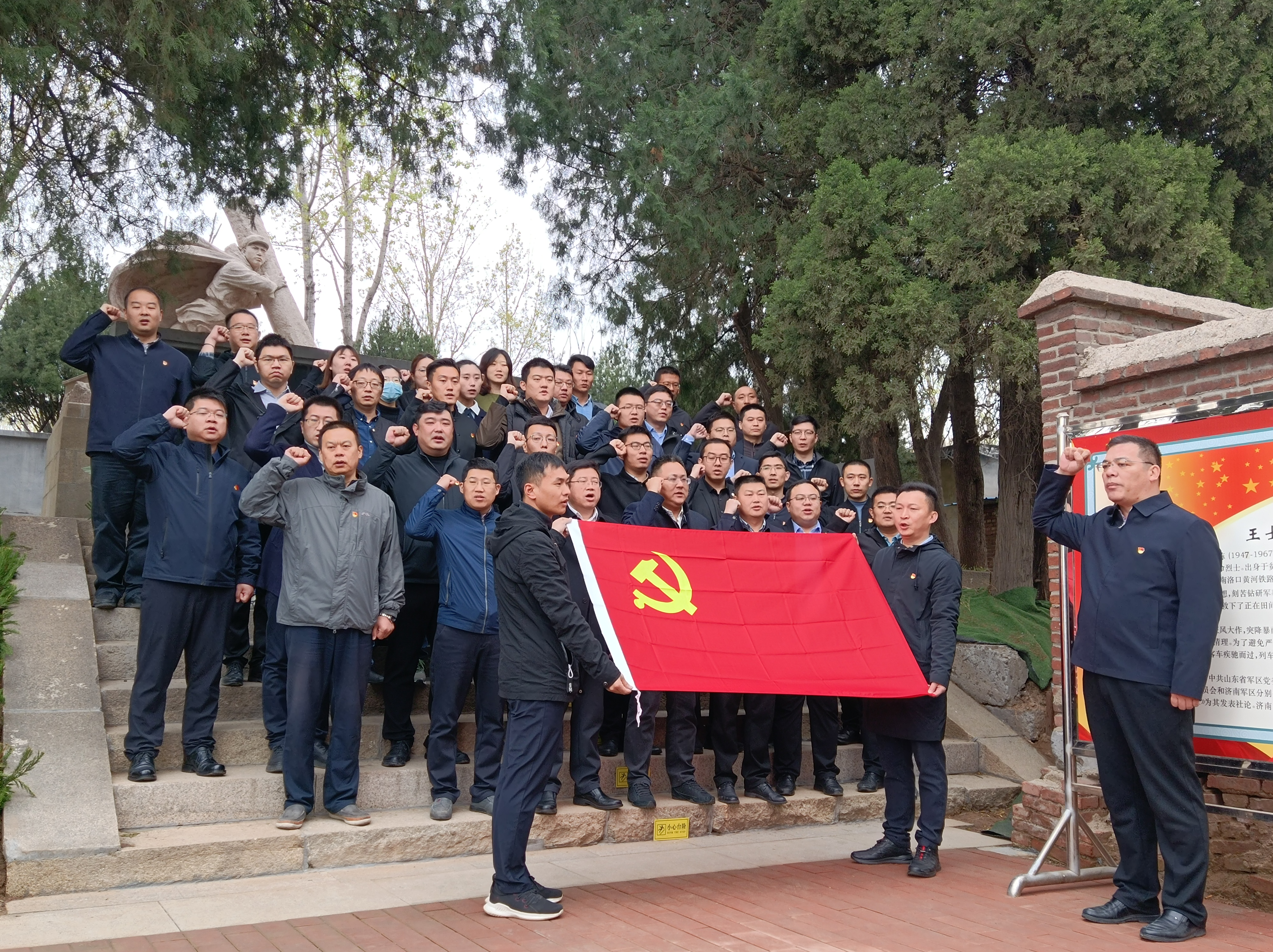 活動中,黨員代表向王士棟烈士敬獻(xiàn)花籃,黨員們瞻仰烈士紀(jì)念碑、深情緬懷烈士功績、寄托哀思并在中國共產(chǎn)黨黨旗的見證下,重溫入黨誓詞。