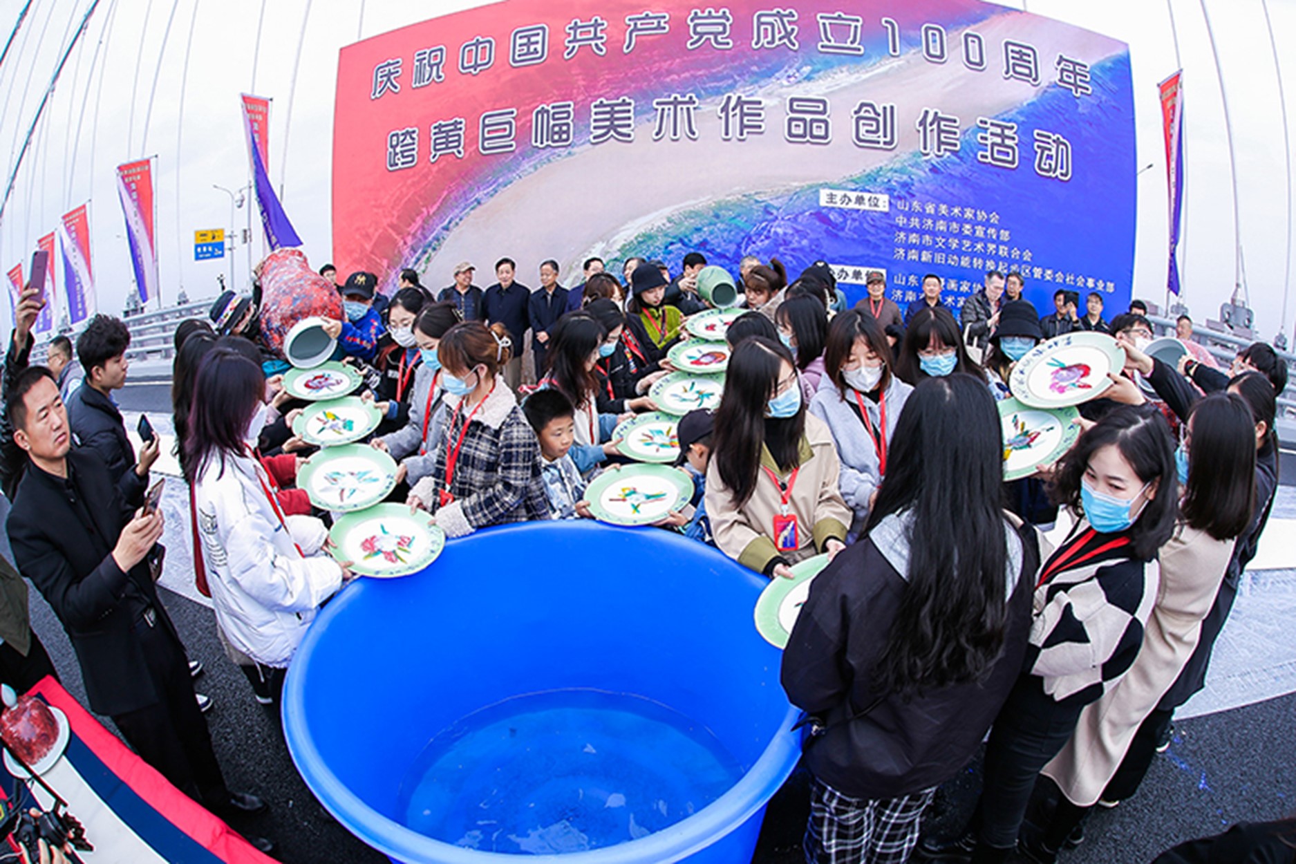 為助力黃河重大國(guó)家戰(zhàn)略實(shí)施,在新時(shí)代現(xiàn)代化強(qiáng)省會(huì)建設(shè)和服務(wù)全市改革發(fā)展大局中彰顯文化擔(dān)當(dāng),11月6日,山東省美術(shù)家協(xié)會(huì)、中共濟(jì)南市委宣傳部、濟(jì)南市文學(xué)藝術(shù)界聯(lián)合會(huì)、濟(jì)南新舊動(dòng)能轉(zhuǎn)換起步區(qū)管委會(huì)社會(huì)事業(yè)部在濟(jì)南鳳凰黃河大橋聯(lián)合組織舉辦慶祝中國(guó)共產(chǎn)黨成立100周年跨黃巨幅美術(shù)作品創(chuàng)作活動(dòng)。活動(dòng)旨在進(jìn)一步保護(hù)、傳承和弘揚(yáng)黃河文化,深入挖掘黃河文化的時(shí)代價(jià)值,以?xún)?yōu)秀的藝術(shù)作品記錄新時(shí)代、謳歌新時(shí)代,為“文化濟(jì)南”建設(shè)貢獻(xiàn)文藝力量。
