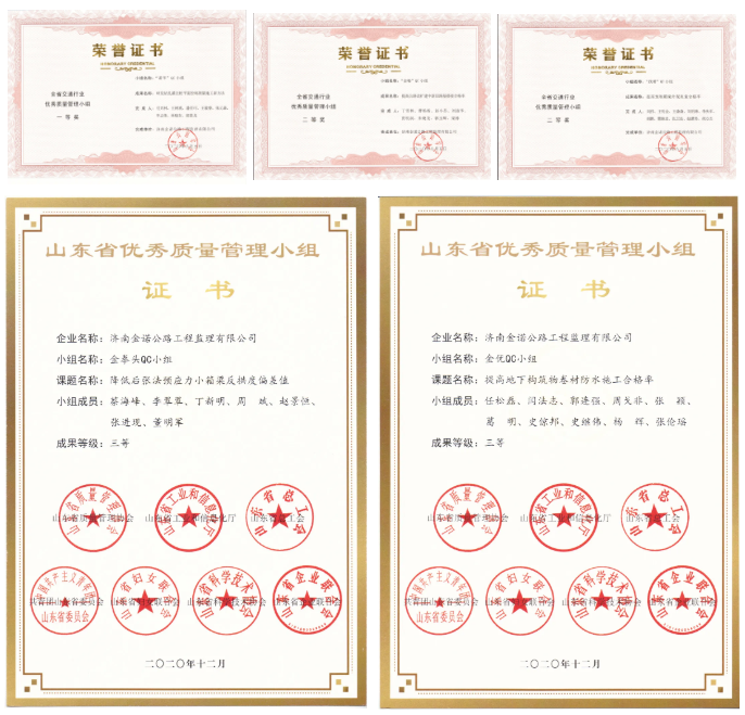質量是企業(yè)的生命,工程質量是工程建設的核心。金諾公司積極組織科技工作者參加全面質量管理培訓、鼓勵科技工作者依托監(jiān)理服務項目開展全面質量管理活動。2020年度金諾公司組建了10個QC小組,取得QC成果11篇。其中4個QC小組(成果)獲地市級獎項,4個QC小組(成果)獲省部級獎項。