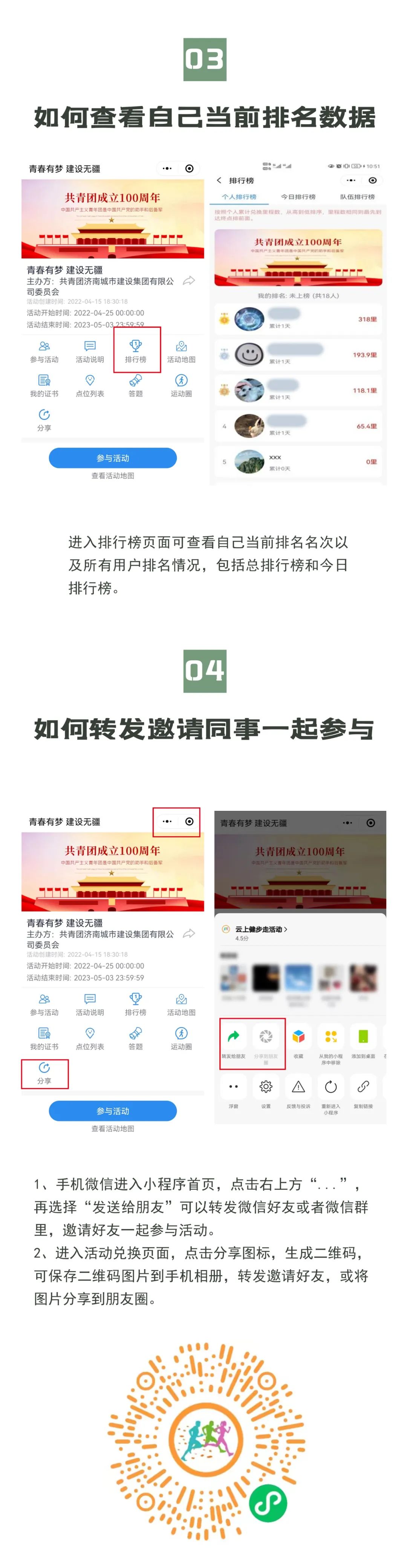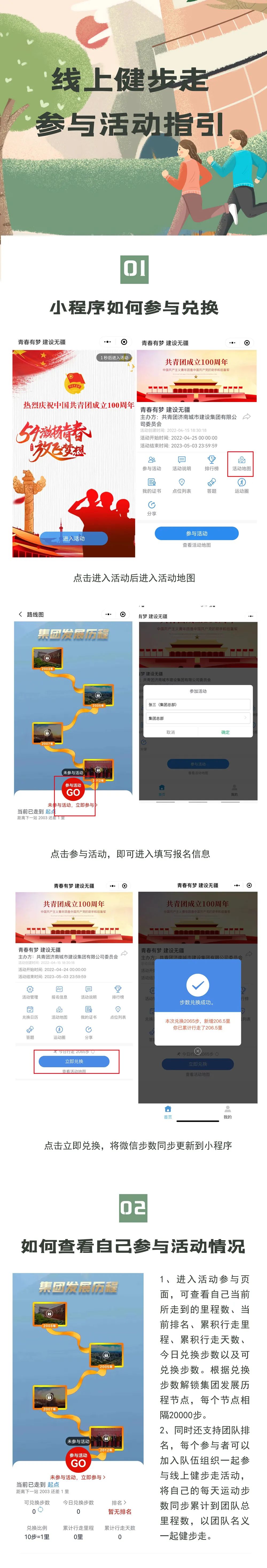 為慶祝建團100周年,開展好“百年崢嶸、初心不改、青春與共、砥礪前行”主題教育實踐活動,展現集團自成立以來的光輝歷程,賡續(xù)集團紅色精神、凝聚集團奮進力量,不斷增強廣大職工的身體素質和健康水平,不斷提高集團的凝聚力和向心力。由共青團濟南城市建設集團有限公司委員會主辦,共青團濟南金曰公路工程有限公司委員會、濟南新城文化傳媒有限公司承辦的“青春有夢 建設無疆”——職工線上健步走活動將于今晚零點正式上線,活動時間為2022年4月25日——5月3日(共十天)。