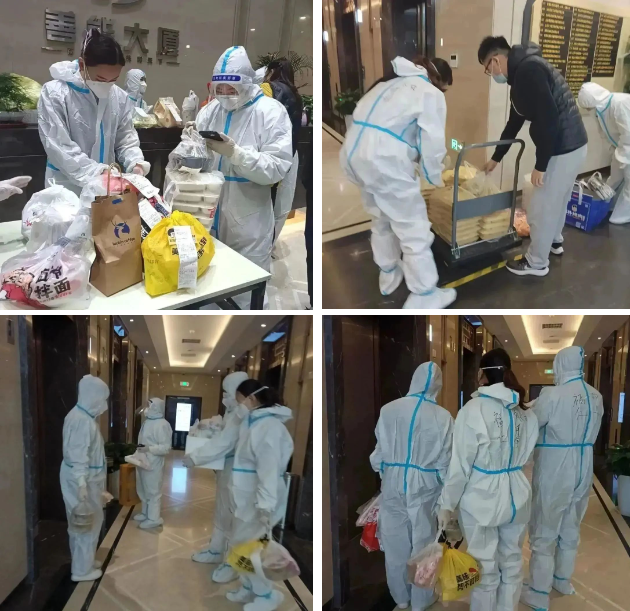 因項(xiàng)目臨時(shí)封控,為防止業(yè)主上下樓層增加交叉感染的可能性,善能大廈福仁服務(wù)全體員工全副武裝,統(tǒng)一為業(yè)主配送餐食,保障業(yè)主的正常就餐,讓業(yè)主吃好、吃飽,緩解因封控帶來(lái)的情緒壓力。等他們忙碌完送餐的工作,又要投入到其他防疫工作中去,常常一天下來(lái)也無(wú)法保證吃上一頓飯,可她們卻微笑著說(shuō):“忙下來(lái)也不覺(jué)得餓,能讓業(yè)主安心,及時(shí)吃上熱乎飯,我們就放心了……”