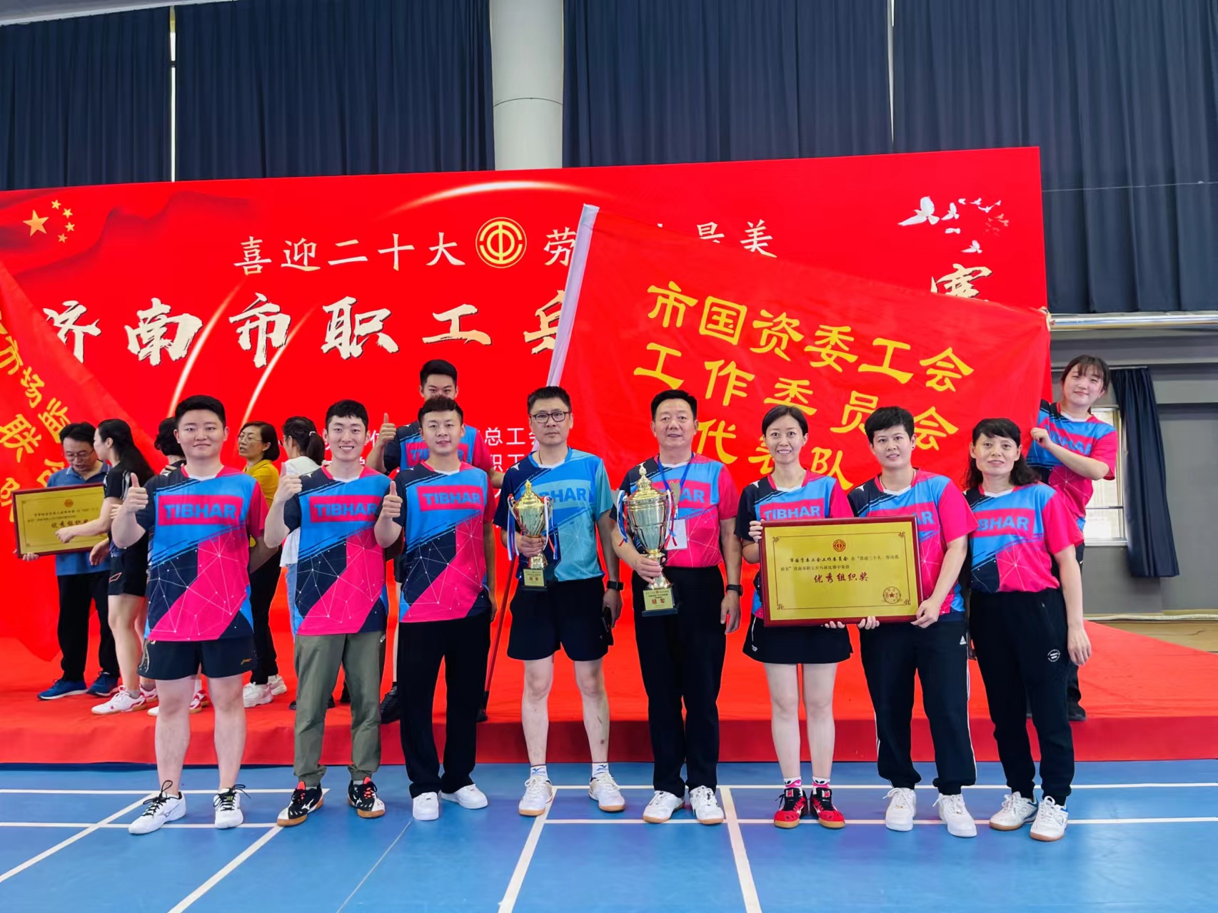 9月17日下午,“喜迎二十大·勞動我最美”濟南市職工乒乓球比賽在山東濟南工人文化宮職工健身中心閉幕。市總工會常務副主席呂燦華出席閉幕式,并為獲獎代表隊頒獎。市總工會副主席蒲玉全、經審委主任劉明忠、一級調研員常江,各參賽隊運動員代表參加閉幕式。