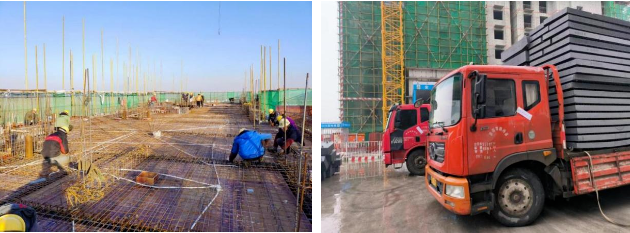 項目整體實行閉環(huán)管理,工人生活區(qū)位于項目內部,從而保證項目封控期間各樓棟作業(yè)人員工種數(shù)量齊全,關鍵崗位不空缺,保障了項目生產“人力”。面對封控、材料供應、運輸困難等問題,項目部提早謀劃,現(xiàn)場優(yōu)化布局,提前儲備關鍵物資,如鋼筋、預制構件、保溫板等材料,同時物料進出場進行專班管理,提前報備、專人接送、封條張貼、專人盯守、過渡區(qū)消殺等管控流程配合嚴密,保障了項目生產“物力”。
