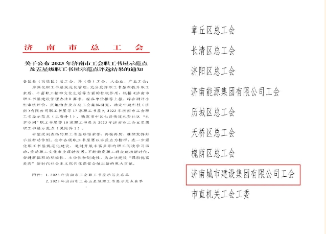 12月18日,濟南市總工會發(fā)布《關(guān)于公布2023年濟南市工會職工書屋示范點及五星級職工書屋示范點評選結(jié)果的通知》,濟南城市建設(shè)集團有限公司職工書屋獲評2023年濟南市工會職工書屋示范點。