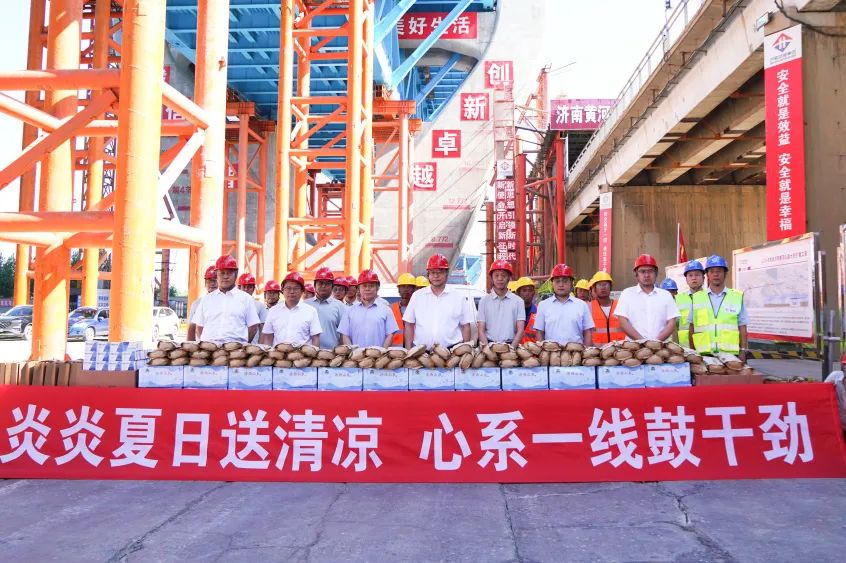 活動中,史海成一行先后前往 G104 濟南黃河公路大橋擴建項目、黃河體育中心專業(yè)足球場項目,詳細了解了現(xiàn)場施工進度、工程質(zhì)量、安全文明施工等情況,并與一線員工親切交流,感謝他們長期以來為項目建設(shè)及企業(yè)發(fā)展作出的貢獻,為一線員工發(fā)放防暑降溫物資。