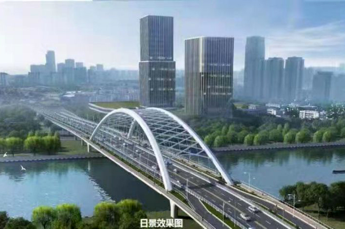 二里橋路跨京杭運河節(jié)點工程是京杭運河上單跨徑最大的橋梁工程,項目起點順接二里橋路,向東延伸至京杭北路,長840米,寬40米,工程總投資約2.85億元。橋梁設(shè)計方案為“鏡湖明月”,采用“鋼箱提籃拱”結(jié)構(gòu),造型美觀,與運河兩岸建筑和環(huán)境巧妙融合。
