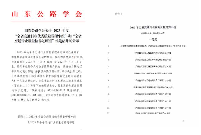 山東公路學(xué)會(huì)發(fā)布《山東公路學(xué)會(huì)關(guān)于2023年度“全省交通行業(yè)優(yōu)秀質(zhì)量管理小組”和“全省交通行業(yè)質(zhì)量信得過(guò)班組”推選結(jié)果的公示》。金曰公司“篤行”“科創(chuàng)中心”“路安”“橋安”“求真”“鵲鳴”6個(gè)QC小組成果榮獲一等獎(jiǎng),其他成果另獲二等獎(jiǎng)19項(xiàng)、三等獎(jiǎng)5項(xiàng);5個(gè)班組獲得“全省交通行業(yè)信得過(guò)班組”稱號(hào)。
