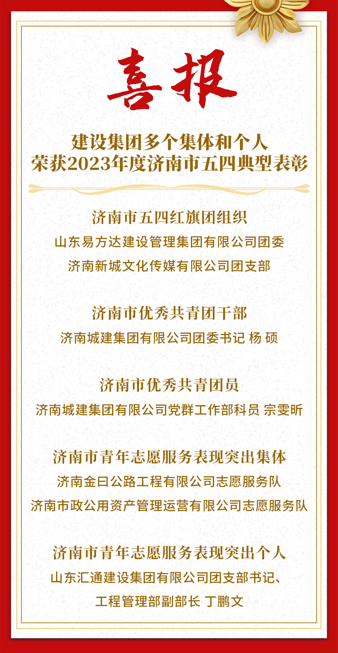 近日,共青團(tuán)濟(jì)南市委發(fā)布《關(guān)于2023年度濟(jì)南市五四典型的表揚(yáng)通報(bào)》,對“濟(jì)南市五四紅旗團(tuán)組織”“濟(jì)南市優(yōu)秀共青團(tuán)干部”“濟(jì)南市優(yōu)秀共青團(tuán)員”“濟(jì)南市青年志愿服務(wù)表現(xiàn)突出集體”“濟(jì)南市青年志愿服務(wù)表現(xiàn)突出個(gè)人”進(jìn)行通報(bào)表揚(yáng),濟(jì)南城市建設(shè)集團(tuán)榮獲多項(xiàng)榮譽(yù)稱號。