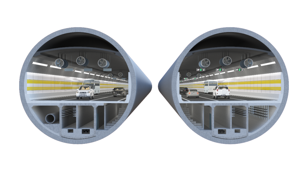為減少市政管線過(guò)黃河成本,充分利用市政隧道下部通道資源搭載穿黃河市政管線,隧道下部預(yù)留穿黃河市政管線艙。同時(shí),盾構(gòu)段采用在車(chē)行道路面下設(shè)置逃生疏散樓梯與專(zhuān)用逃生救援通道(縱向逃生救援方案),并結(jié)合工作井設(shè)置車(chē)行橫通道、明挖暗埋段設(shè)置人行橫通道的縱向結(jié)合橫向疏散救援的綜合方案,形成可靠高效的疏散救援設(shè)施,確保運(yùn)行安全。