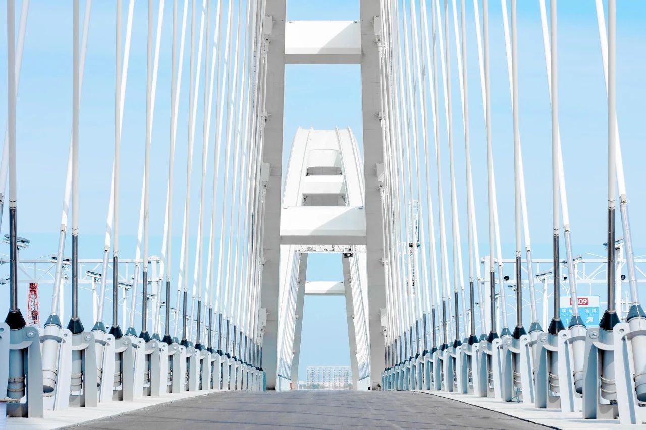 大橋橋塔整體造型源于“水滴”曲線線條,剛柔相濟,輕盈通透,使橋梁與環(huán)境更有效的融合,也寓意著水文化對于濟南這座城市的特殊意義,象牙白橋塔搭配水藍色鋼桁梁,則與泉水遙相呼應相得益彰。