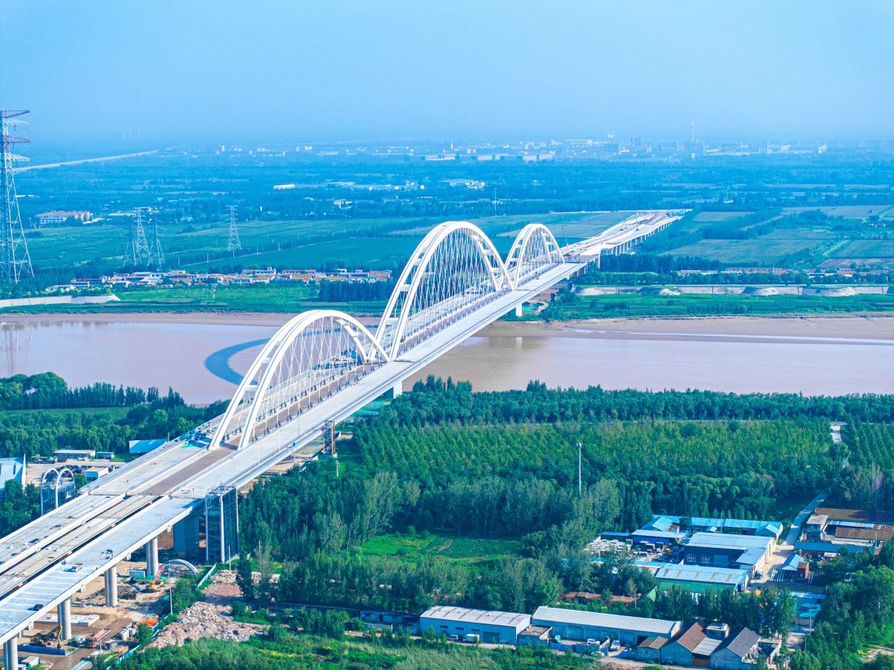 濟(jì)南黃河齊魯大橋?yàn)辄S河之上首座下承式網(wǎng)狀系桿拱橋,主跨徑達(dá)420米、寬60.7m,創(chuàng)世界同類(lèi)型橋梁最大跨徑、最大梁寬,其400Mpa超高應(yīng)力幅拉索在橋梁建設(shè)領(lǐng)域首次研發(fā)應(yīng)用。