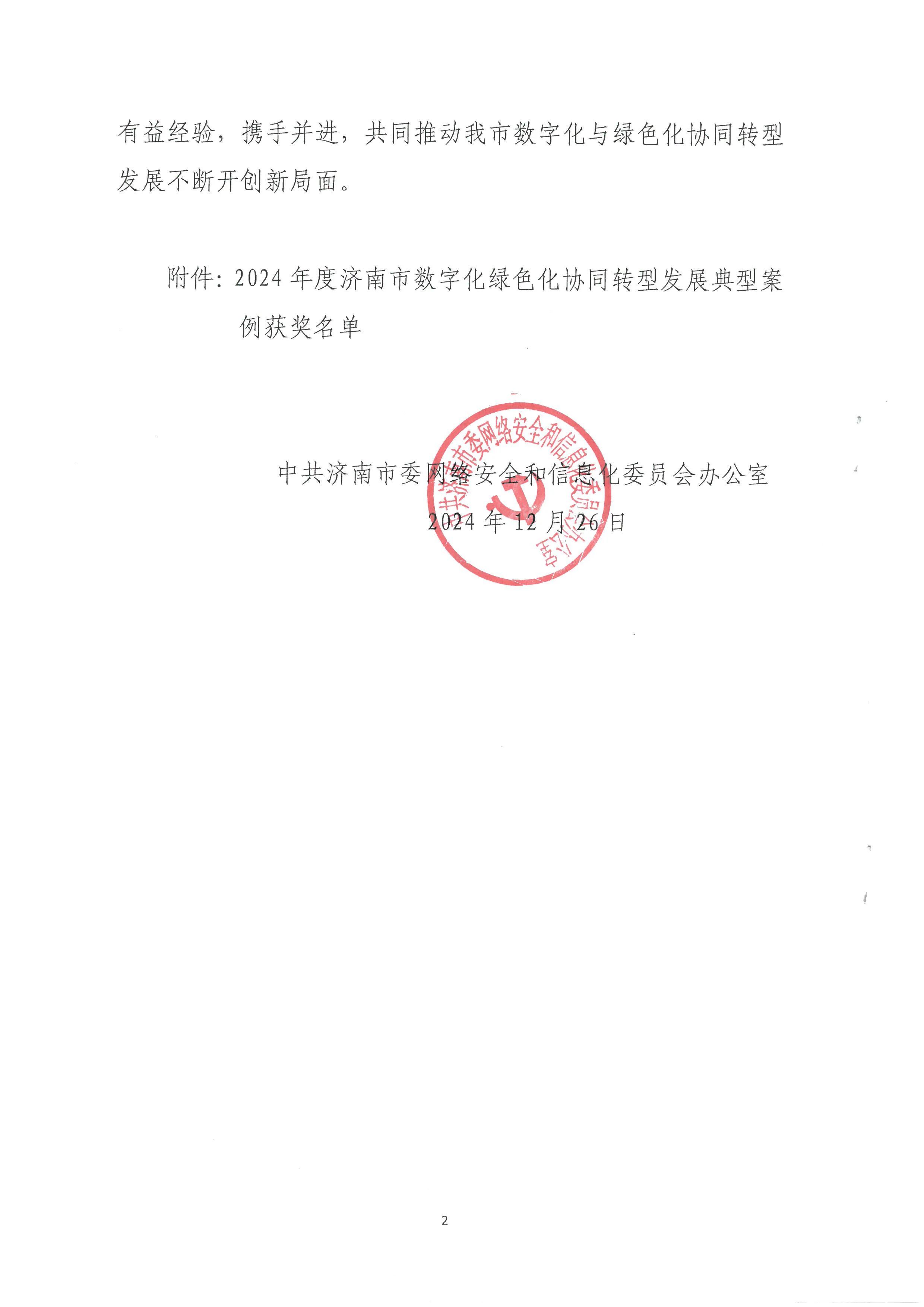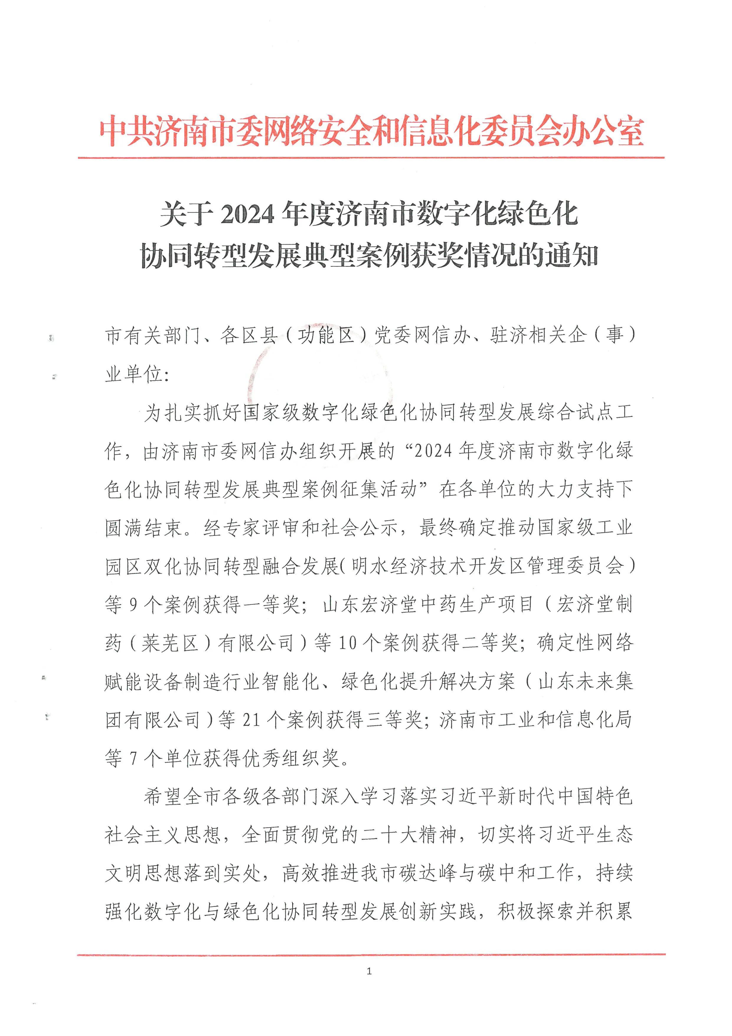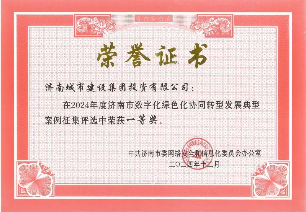 近日,濟(jì)南市委網(wǎng)信辦公布了《2024年度濟(jì)南市數(shù)字化綠色化協(xié)同轉(zhuǎn)型發(fā)展典型案例獲獎情況的通知》。經(jīng)過嚴(yán)格的考察、評審與公示,建設(shè)集團(tuán)所屬濟(jì)南城市建設(shè)集團(tuán)投資有限公司提交的“綠色金融協(xié)同賦能平臺”案例在眾多參評項目中脫穎而出,榮獲一等獎。