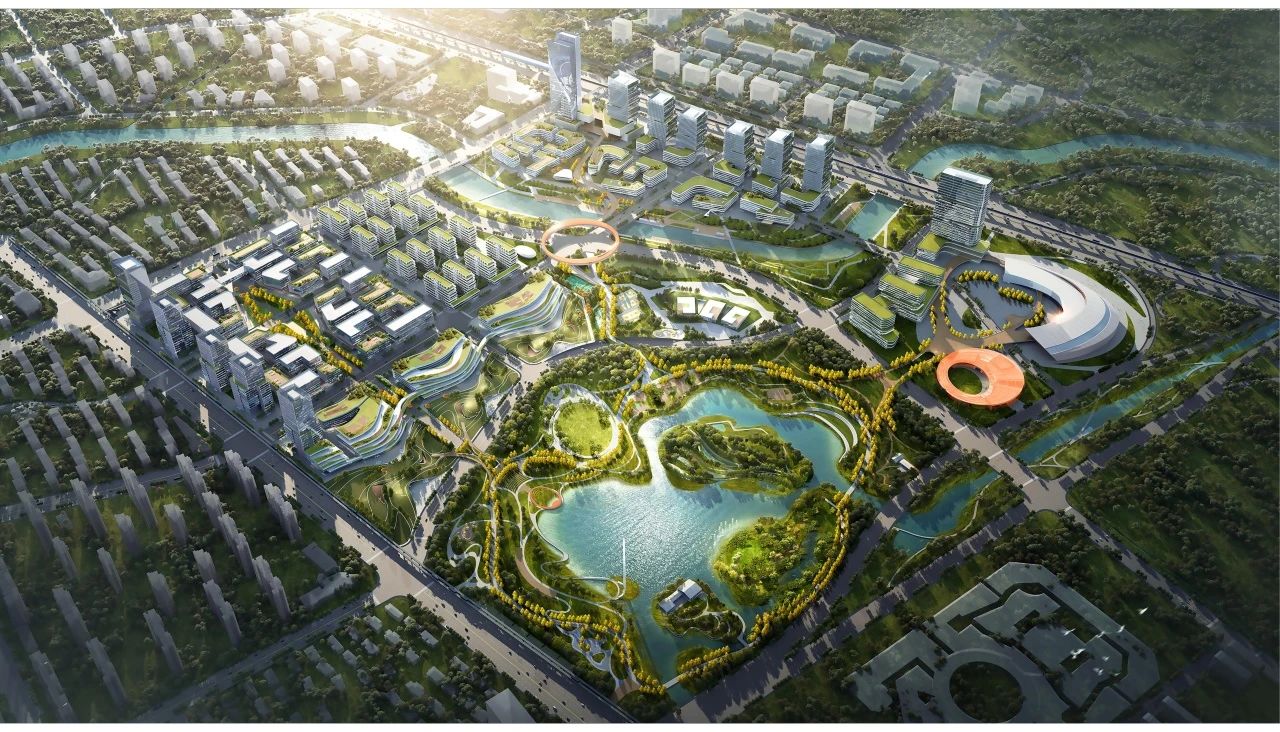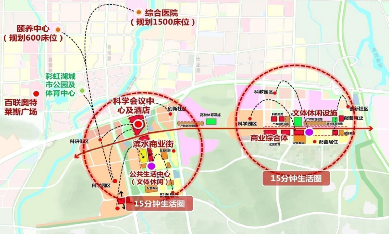 本區(qū)域配套設(shè)施完善,統(tǒng)籌共享城市級醫(yī)療、文體及商業(yè)設(shè)施。以科創(chuàng)城為中心,兩公里范圍內(nèi)規(guī)劃建設(shè)有1500床位的綜合醫(yī)院、600床位的頤養(yǎng)中心、占地40公頃的彩虹湖城市公園以及建筑面積10萬平方米的奧特萊斯商業(yè)綜合體等。科創(chuàng)城內(nèi)部結(jié)合景觀水系,規(guī)劃建設(shè)共享服務(wù)帶,集中設(shè)置眾創(chuàng)平臺、文體活動中心、餐飲商業(yè)、社區(qū)醫(yī)院等,并同步規(guī)劃建設(shè)可容納2000人的會議中心和1000客房的國際酒店。