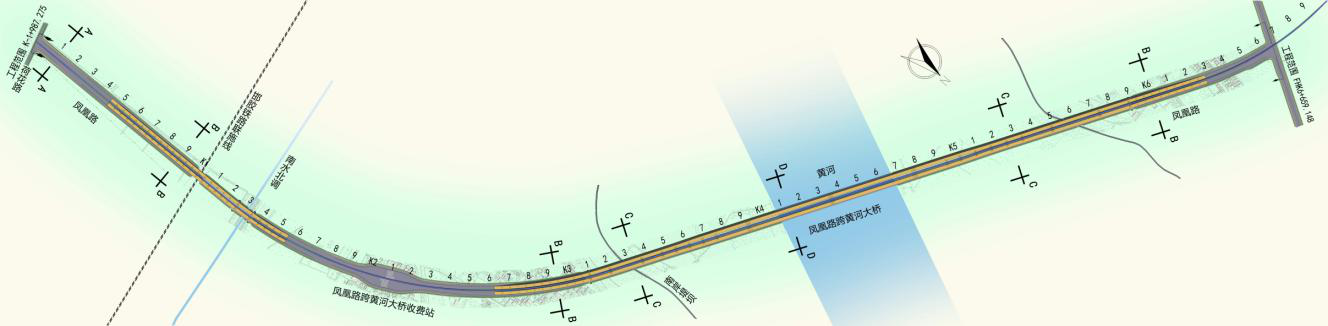 鳳凰路北延工程位于濟(jì)南市歷城區(qū)、高新區(qū)、濟(jì)陽縣,路線南起壩王路與荷花路交叉口,接現(xiàn)狀壩王路,依次跨越邯膠鐵路聯(lián)絡(luò)線、南水北調(diào)工程濟(jì)東明渠后繼續(xù)往北,在小河套村向西北方向延伸,跨越黃河后,終點(diǎn)位于遠(yuǎn)期規(guī)劃主干路與G220交叉口處。項(xiàng)目全長6659.2米,其中,黃河特大橋長度為3668米,兩端接線長度為2991.2米,包括大橋1座,平面交叉2處,涵洞11道。